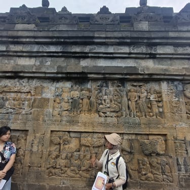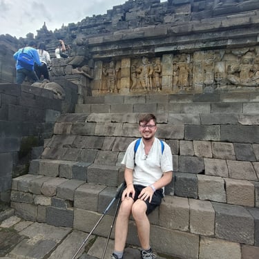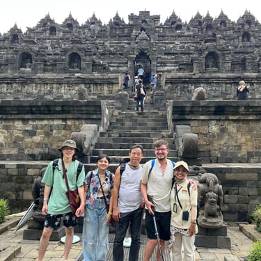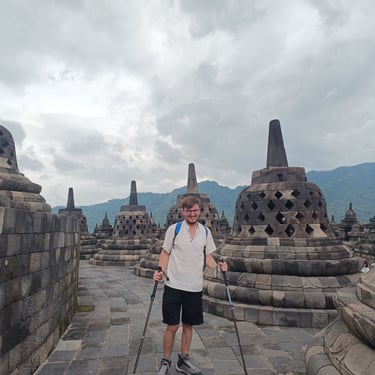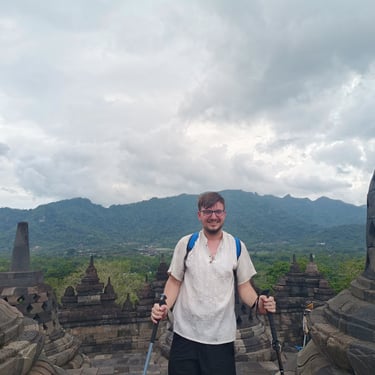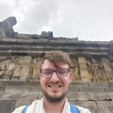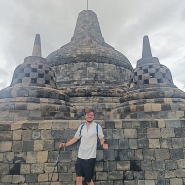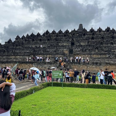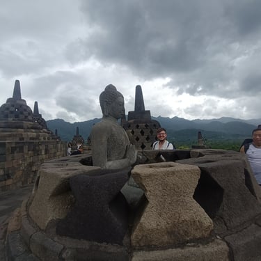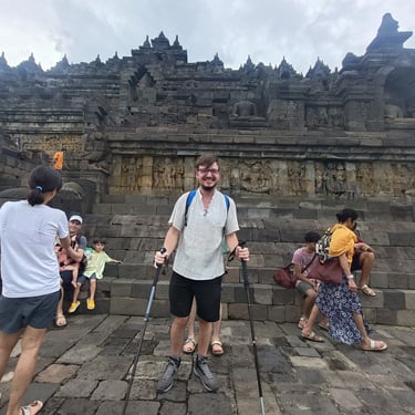 Un immense temple pour moi aujourd'hui, celui de Borobudur. Vu qu'il y a environ 2h de route pour y arriver, je n'ai pas eu spécialement envie de le faire en scooter car ça allait faire long et si jamais il pleut très très long donc Saturday a un ami avec une voiture qui peut nous amener (moyennant finance bien sûr) et on est parti vers 9h30 car on a rendez-vous à 12h30 et je préfère avoir de la marge. On en profite pour manger avant, une sorte de KFC, ils sont très poulet frit en Indonésie, et c'est parti pour la visite guidée. Pas mal de marches des escaliers pas tous facile à monter mais une guide et des touristes sympas qui m'aident sans soucis. Très belle ascension (environ 120 marches) avec une petite explication à chaque étage. Il y en a 10 en tout mais le dernier est réservé pour certaines cérémonies bouddhistes particulières. Visite très agréable même si le prix reste exorbitant pour ici (quasiment 25 euros l'entrée). Le tout se fait complètement en extérieur donc on a été chanceux de ne pas avoir de pluie. Là haut, le panorama est top et vaut le coup d'oeil. 40 minutes de temps libre pour faire le tour prendre des photos, revoir certains étages et on se met en route pour la sortie. Puis route de retour, petit snack et on retrouve notre amie pour une dernière partie de cartes avant de partir demain matin vers Labuan Bajo pour faire l'île de Komodo.