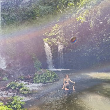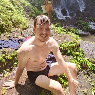 Après donc cette petite galère, on arrive au pied de la cascade et je veux me baigner dedans même si lui n'a pas l'air super emballé par cette idée.