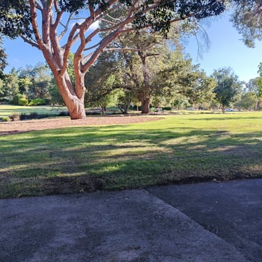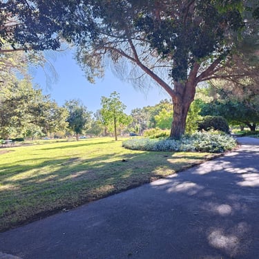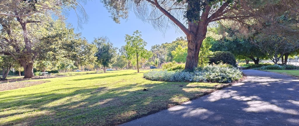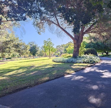 Je vais à un parc situé environ à 1,5km avec petite pause au 3/4 du trajet pour me trouver un restaurant. Finalement j'arrive, je ne vais pas là où je pensais aller car pour le retour ce sera embêtant et finalement l'autre côté est tout aussi verdoyant et magnifique (y a des parcs partout à Adélaïde).