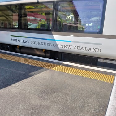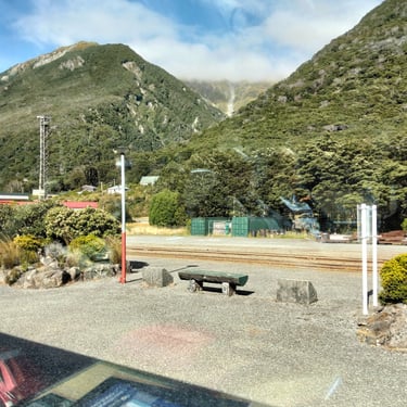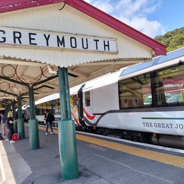 Réveil à 6h car train à 8h15 mais faut bien être en avance pour le check-in. Train très sympathique avec vue incroyable sur les montagnes. Le côté scénique de ce train est le wagon arrière où il n'y a pas de vitres pour de meilleures photos. Arrivé à Greymouth petit tour vite fait.